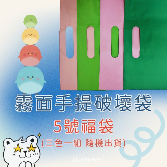 手提霧面5&9號破壞袋 限量獨家福袋隨機顏色 內容物:霧面手提破壞袋顏色隨機,一組共3包(一包100入) ・符合國際ISO9001認證・不含PVC ・取得RCS認證・取得SGS認證・多項環保認證 ・符合網購包裝限制法規・添加25%回收料 【材質】 消光霧面、不透光LDPE低密度聚乙烯 厚度:0.05mm ~ 0.055mm 尺寸大小及每包數量→請參考公版尺寸表 【注意事項】 ・袋子品質優良但因大量製造、非完美商品、人工包裝可能有瑕疵或數量誤差。 ・每批生產顏色因原料或油墨會有些許落差,拍照及環境光線、電腦螢幕皆有影響,請以實體為準。 ・因人力成本考量,訂單未滿500元會直接取消訂單,謝謝您的諒解 ・現場購買無提供此優惠價格,此為購物車優惠價。 ・本賣場支付方式為匯款,無提供其他支付方式。 ・匯款資訊: 808玉山銀行-民生分行 帳戶:0211-940-017286 戶名:永穩企業有限公司 袋類滿$2000 免運 (緩衝包材、膠帶除外)